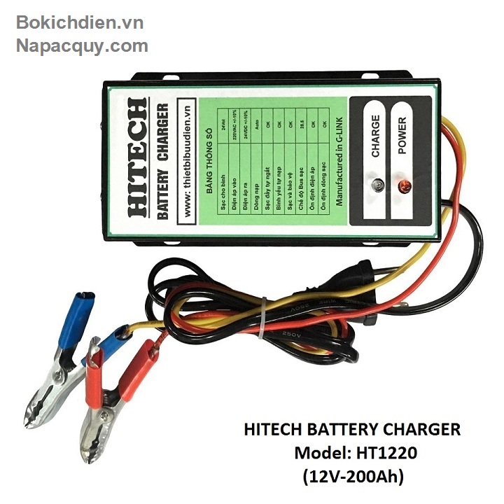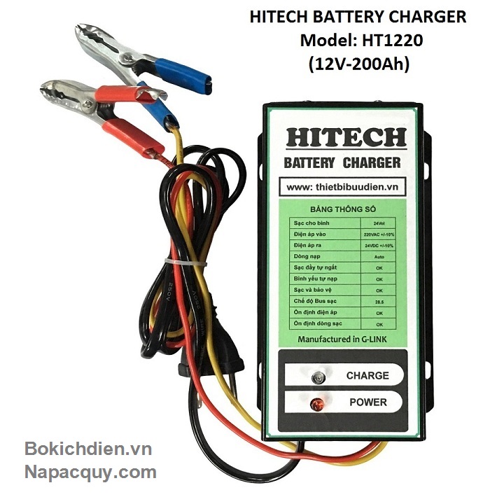 - Máy sạc ắc quy tự động 3 chế độ HITECH Là thiết bị sử dụng để nạp điện cho bình ắc quy khô hoặc ắc quy nước có dung lượng từ 10Ah đến 150Ah. Với dòng sạc tương ứng với ắc quy. Sử dụng nguồn biến áp cao tần cho hiệu xuất cao lên đến 93%. Ổn định dòng sạc trong suốt quá trình sạc ắc quy.