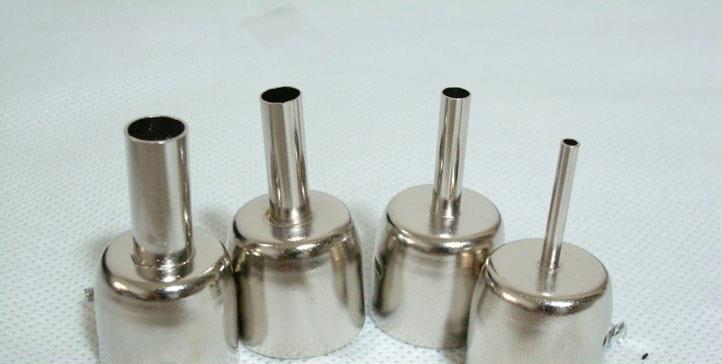 – Đường kính đầu khò quyết định lượng nhiệt và gió. Tùy thuộc kích cỡ linh kiện lớn hay nhỏ mà ta chọn đường kính đầu khò cho thích hợp, tránh đầu quá to hoặc quá nhỏ: Nếu cùng một lượng nhiệt và gió, đầu khò có đường kính nhỏ thì đẩy nhiệt sâu hơn, tập trung nhiệt gọn hơn, đỡ “loang” nhiệt hơn đầu to, nhưng lượng nhiệt ra ít hơn, thời gian khò lâu hơn. Còn đầu to thì cho ra lượng nhiệt lớn nhưng lại đẩy nhiệt nông hơn, và đặc biệt nhiệt bị loang làm ảnh hưởng sang các linh kiện lận cận nhiều hơn.