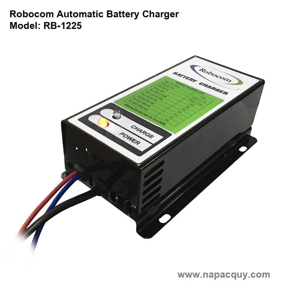 - Máy sạc ắc quy tự động 3 chế độ Robocom Là thiết bị sử dụng để nạp điện cho bình ắc quy khô hoặc ắc quy nước có dung lượng từ 10Ah đến 200Ah. Với dòng sạc tương ứng với ắc quy. Sử dụng nguồn biến áp cao tần cho hiệu xuất cao lên đến 93%. Ổn định dòng sạc trong suốt quá trình sạc ắc quy.